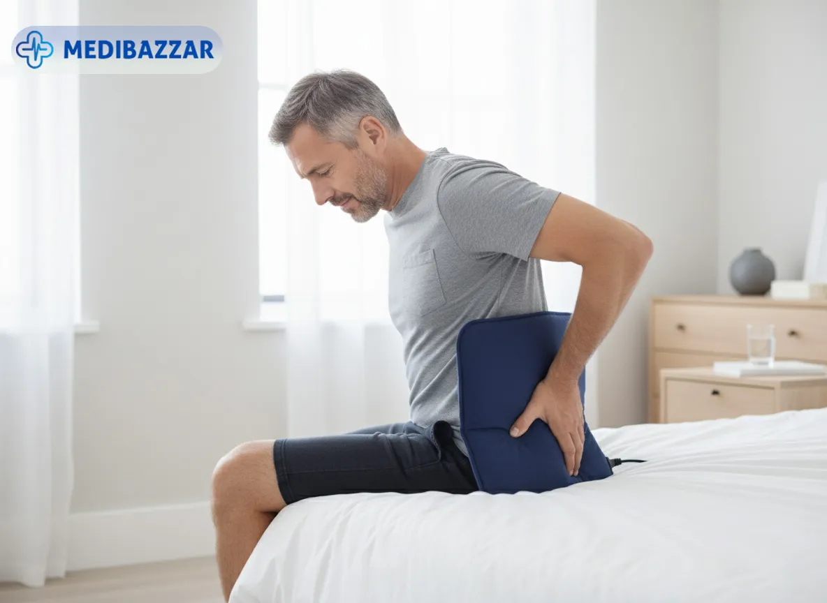 - گرما درمانی با استفاده از پد حرارتی یا کمپرس گرم، جریان خون ناحیه کمر را افزایش داده و اسپاسم عضلات را کاهش میدهد.