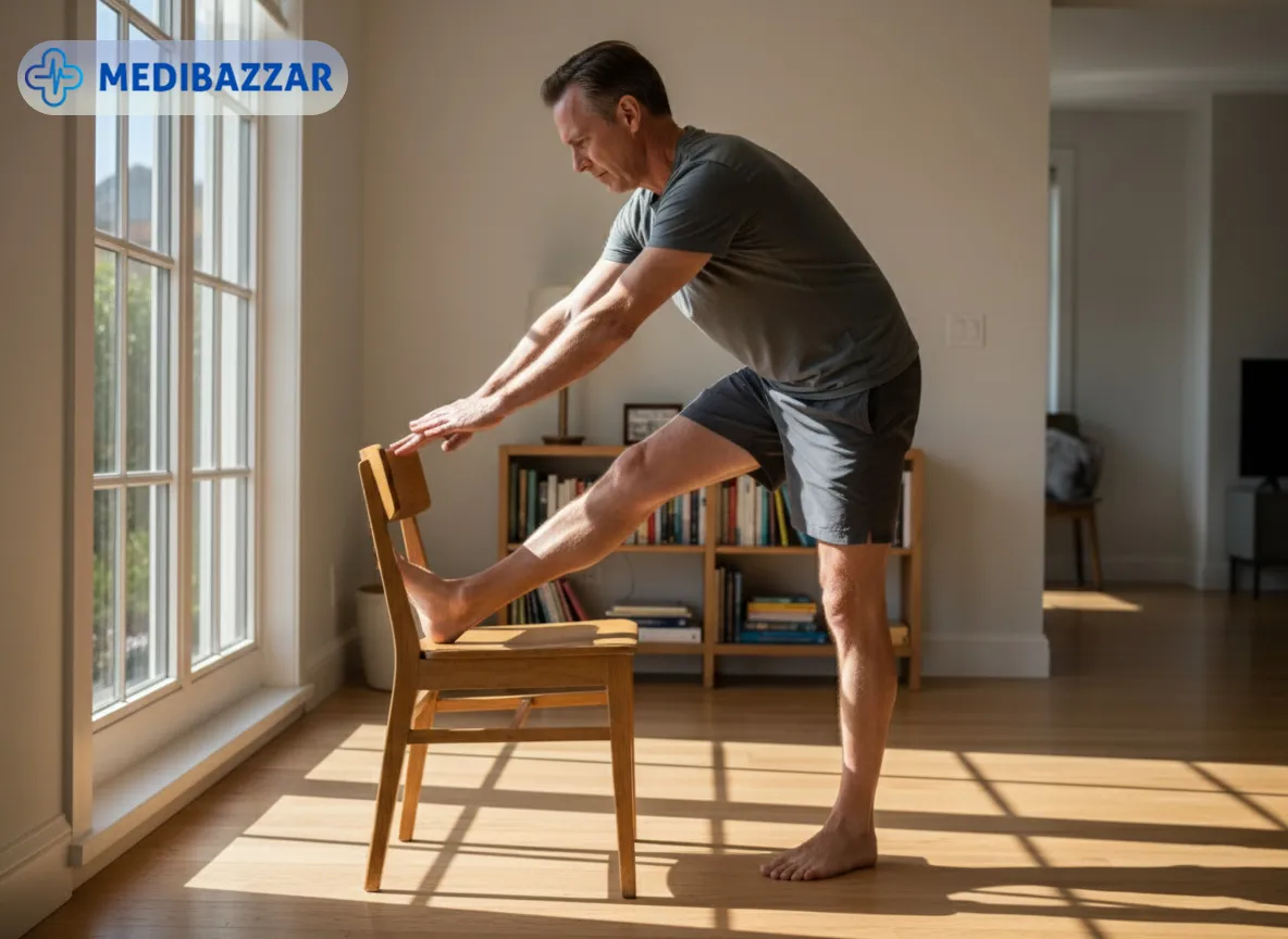 - کشش همسترینگ: در حالت ایستاده، پاشنه پا را روی صندلی گذاشته و بالاتنه را به جلو خم کنید تا پشت ران کشیده شود.